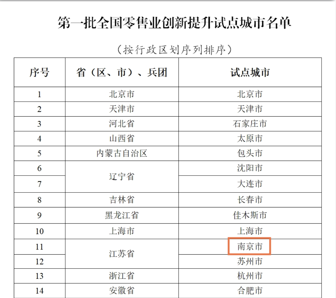 另一方面,近日在商务部网站发布的《第一批全国零售业创新提升试点城市》评审结果公示名单中,38个城市成功入围,试点周期为两年。其中,南京成功入选。此外,长三角还有4座城市入选,即上海、苏州、杭州、合肥。